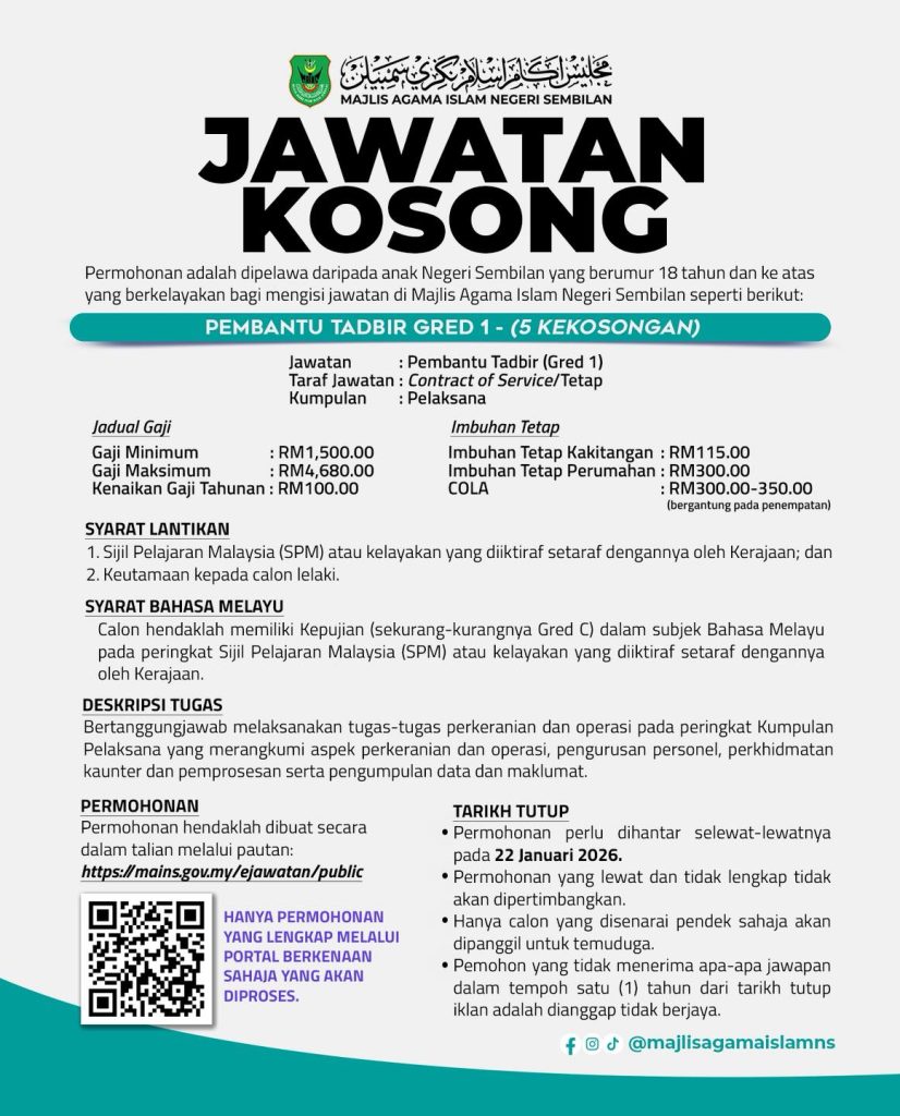 Iklan Kini Jawatan Majlis Agama Islam Negeri Sembilan (MAINS) / Kekosongan Pembantu Tadbir Gred 1 Klik Iklan Jawatan Disini