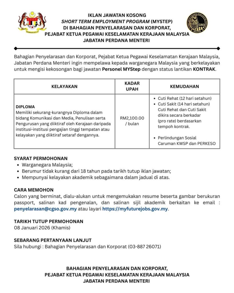 Iklan Kini Jawatan Pejabat Ketua Pegawai Keselamatan Malaysia (CGSO) / Kekosongan Personel Mystep Klik Iklan Jawatan Disini