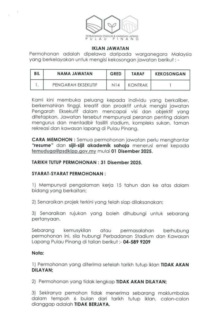 Iklan Kini Perbadanan Stadium & Kawasan Lapang Pulau Pinang