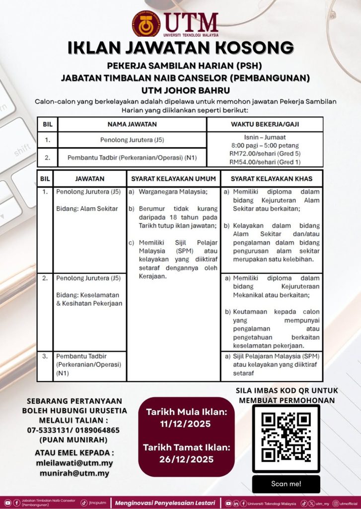 Iklan Kini Universiti Teknologi Malaysia (UTM) / Kekosongan Pekerja Sambilan Harian (PSH) Klik Iklan Jawatan