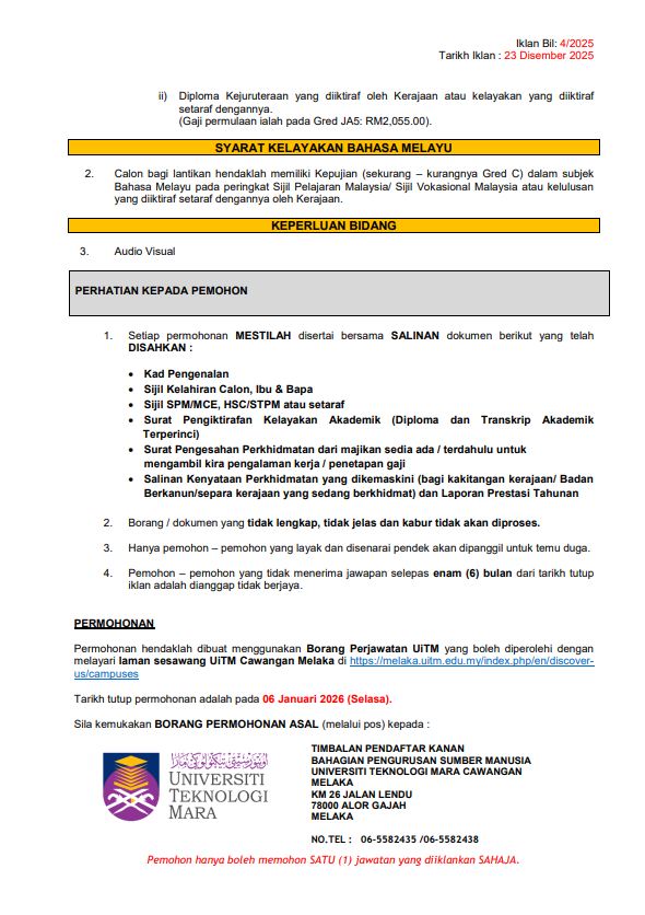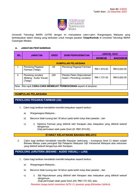 Iklan Kini Universiti Teknologi Mara (UiTM) Melaka / Kekosongan Pelbagai Jawatan