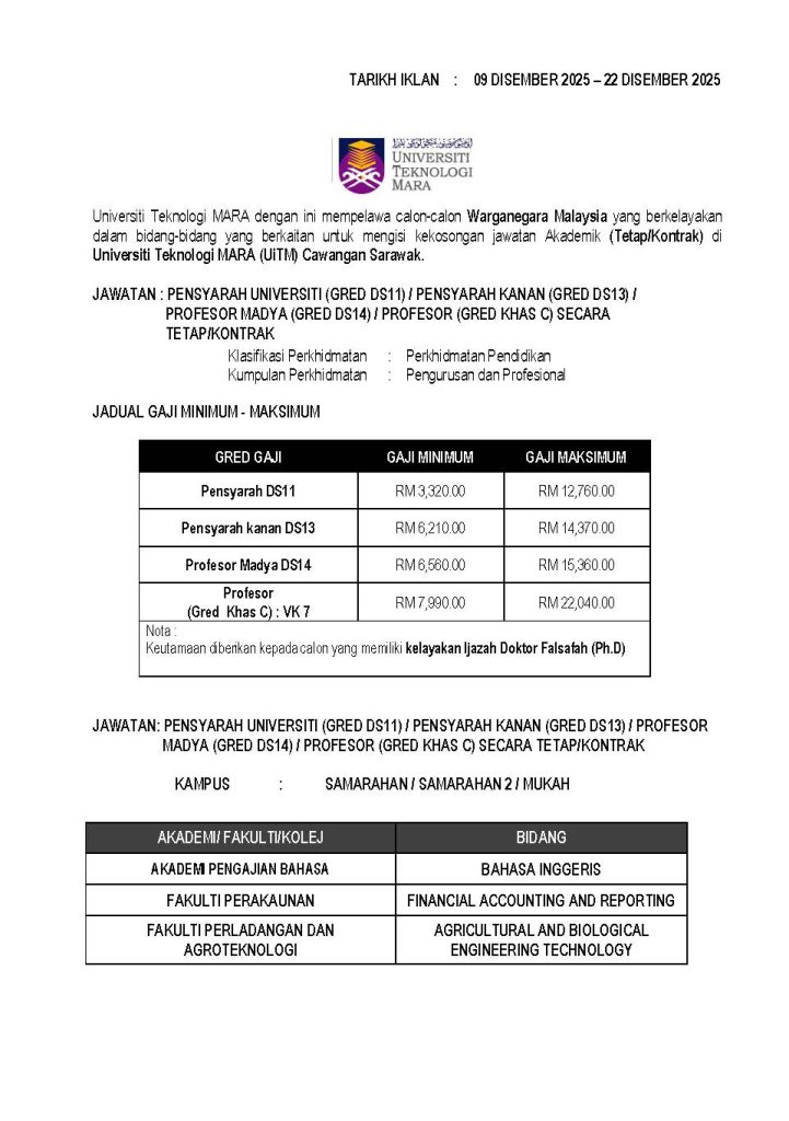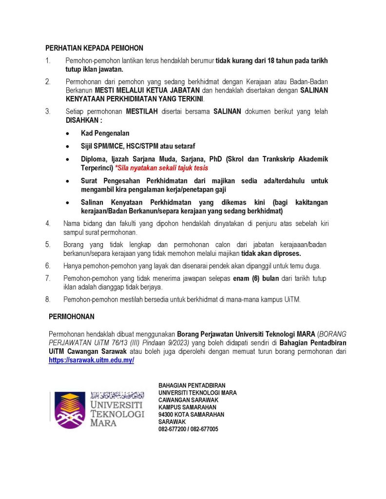 Iklan Kini Universiti Teknologi Mara (UiTM) Sarawak / Kekosongan Jawatan Akademik
