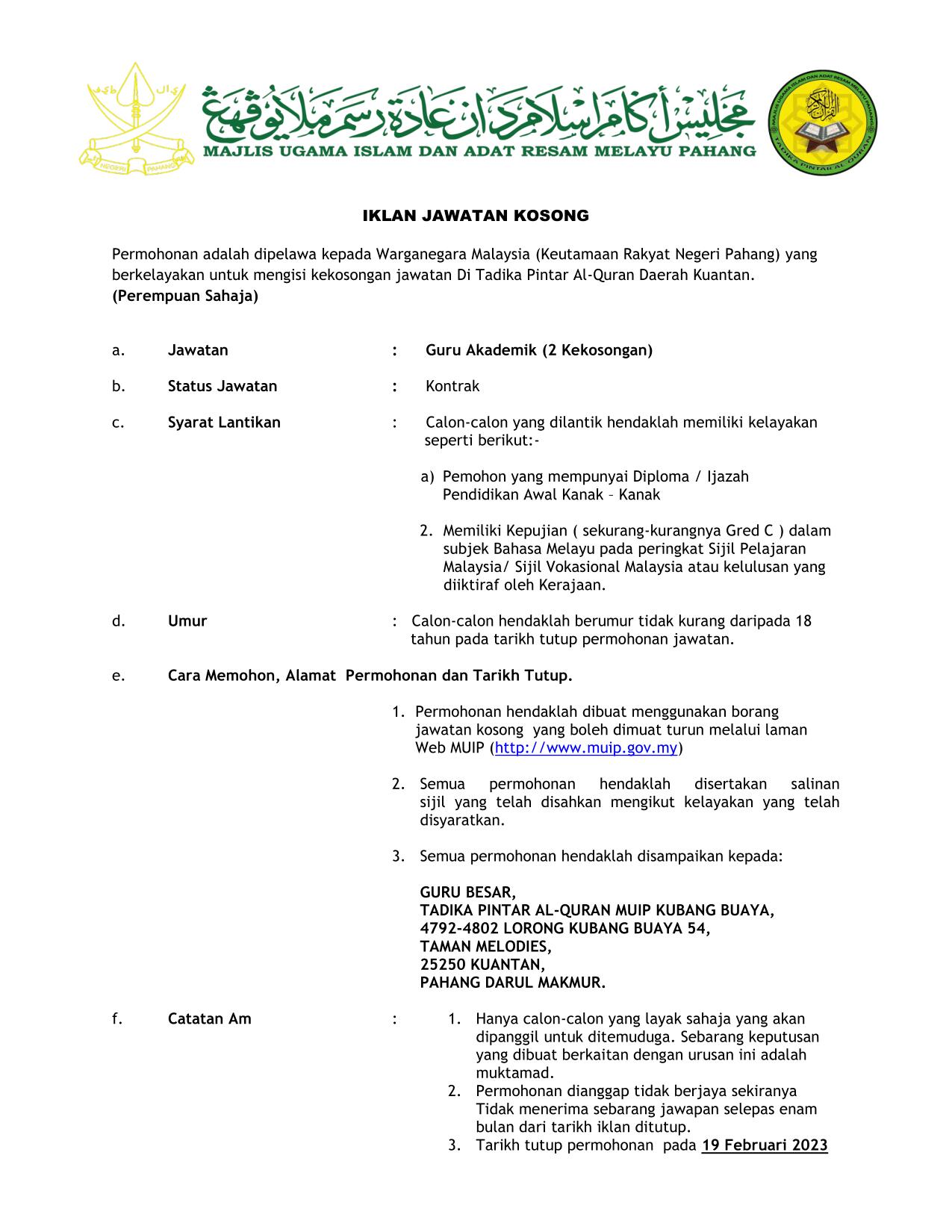 Iklan Jawatan Majlis Ugama Islam dan Adat Resam Melayu Pahang (MUIP)