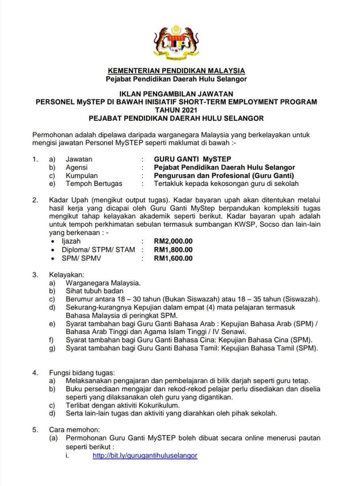 Jawatan Kosong Guru Ganti MySTEP KPM 2021 Di Buka. Kelayakan SPM, STPM/Diploma & Ijazah. Mohon Sekarang