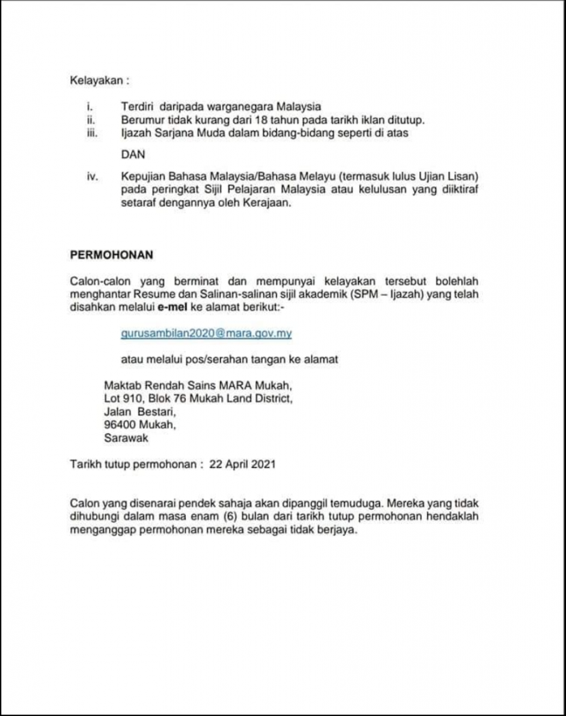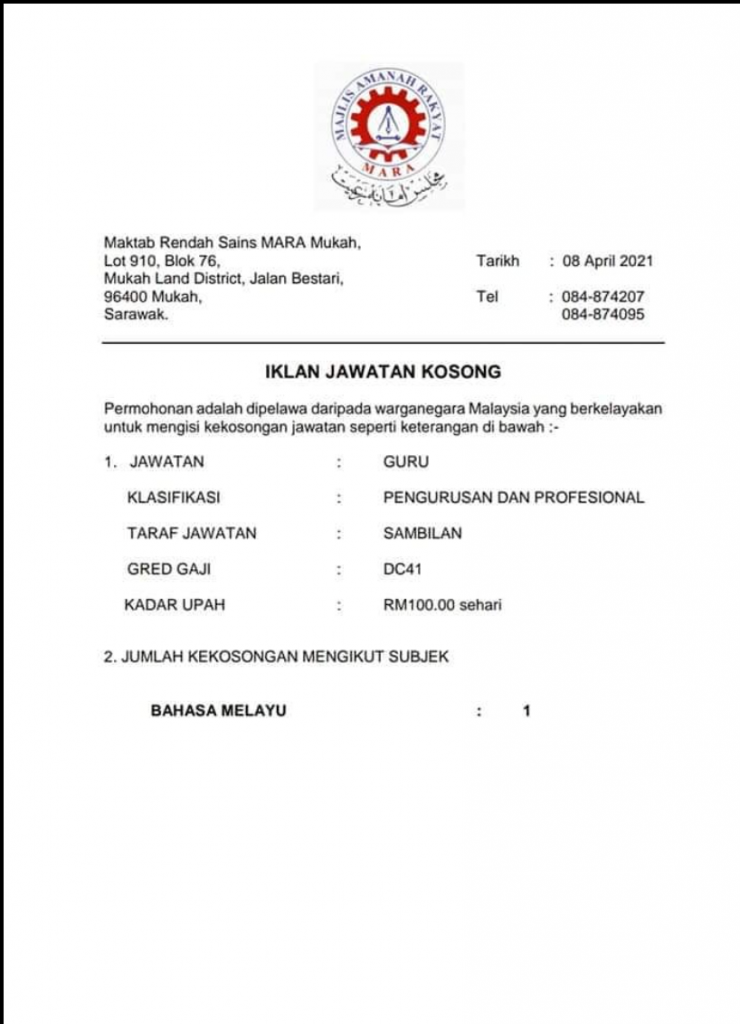 JAwatan Kosong Maktab Rendah Sains Mara (MRSM)