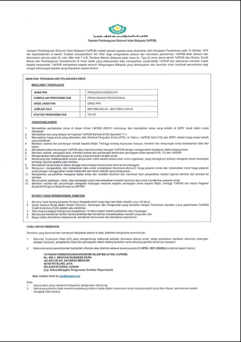 - Nama Majikan: Jawatan Kosong Yayasan Pembangunan Ekonomi Islam Malaysia (YaPeim)