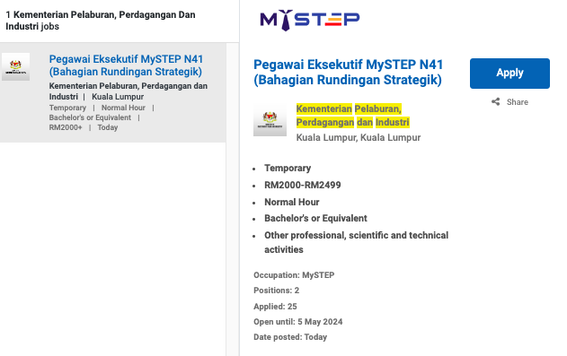 Permohonan jawatan ini boleh dibuat melalui Portal MyFutureJobs. Sila ke Portal MyFutureJobs dan Masukkan Kata Carian yang ingin dicari “Kementerian Pelaburan, Perdagangan dan Industri” di bahagian carian untuk memohon jawatan yang diiklankan.