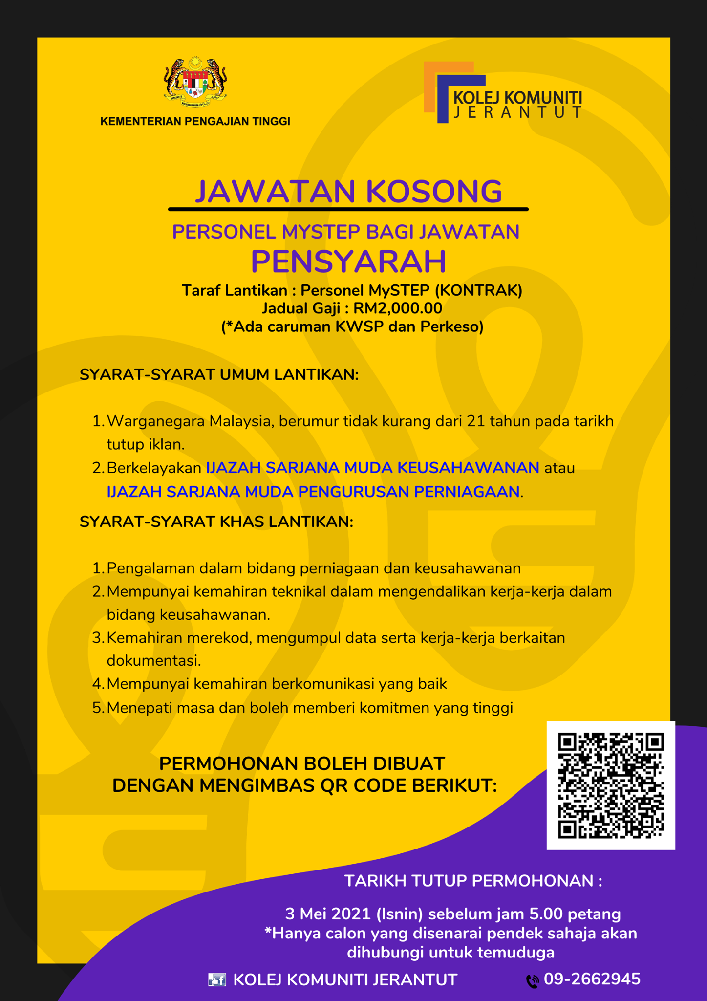 - Tarikh Tutup Permohonan: 03 Mei 2021