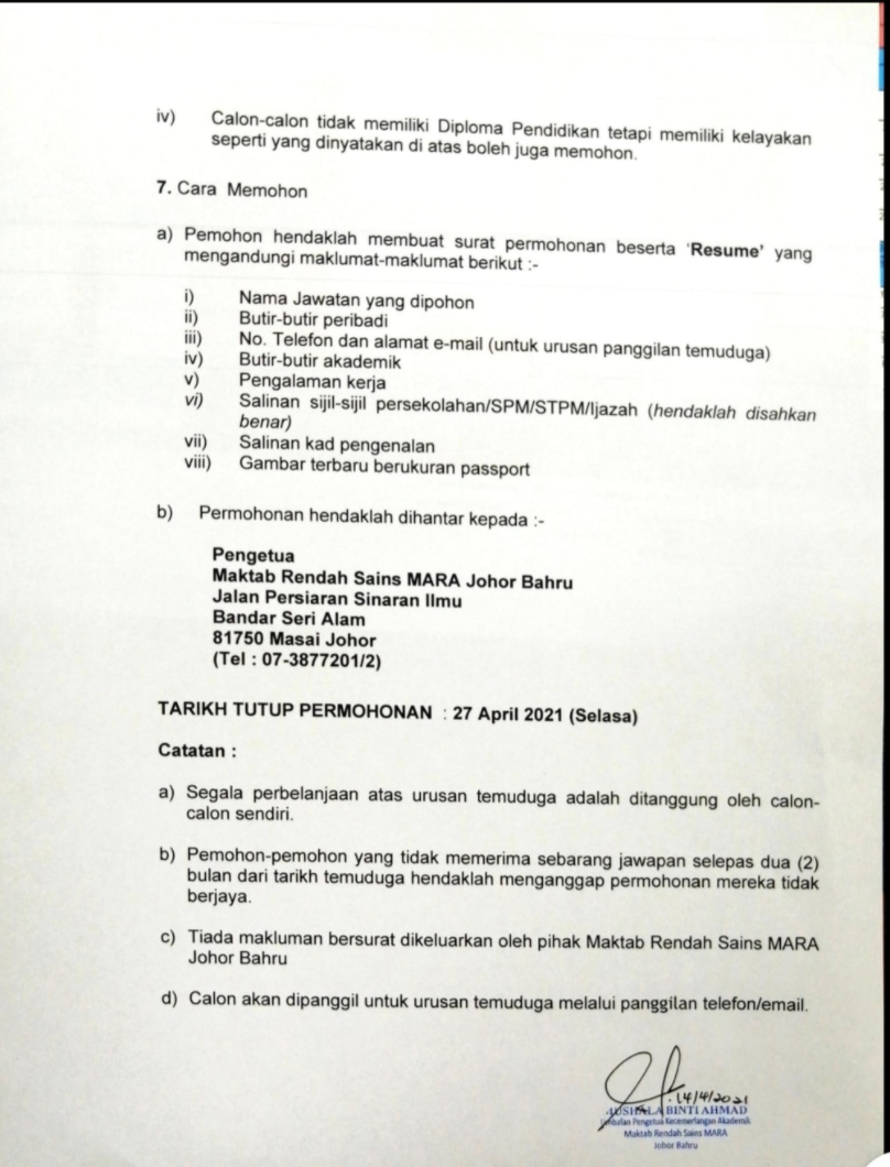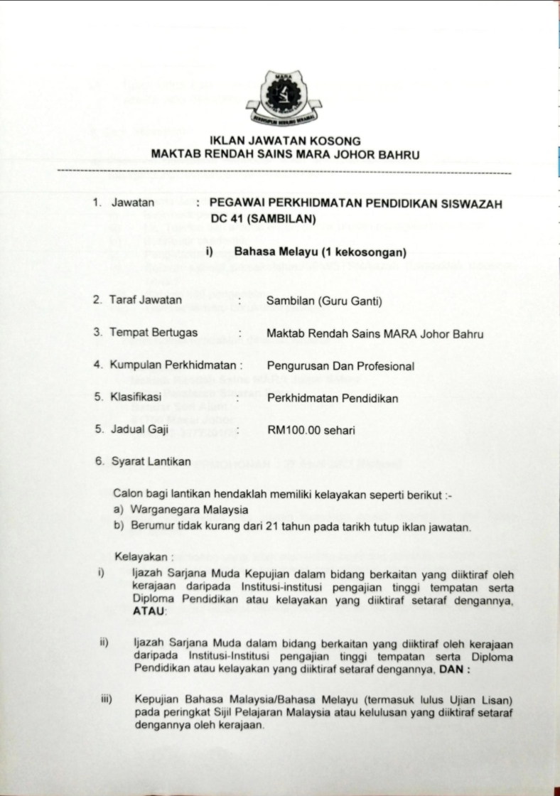 Iklan Jawatan Maktab Rendah Sains Mara (MRSM)