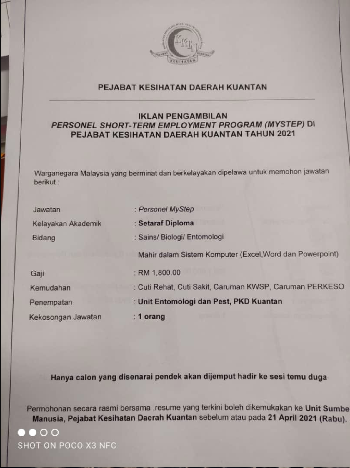 - Nama Majikan: Pejabat Kesihatan Daerah Kuantan