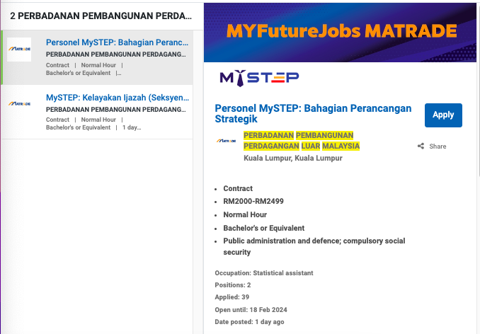 Permohonan jawatan ini boleh dibuat melalui Portal MyFutureJobs. Sila ke Portal MyFutureJobs dan Masukkan Kata Carian yang ingin dicari “PERBADANAN PEMBANGUNAN PERDAGANGAN LUAR MALAYSIA” di bahagian carian untuk memohon jawatan yang diiklankan.