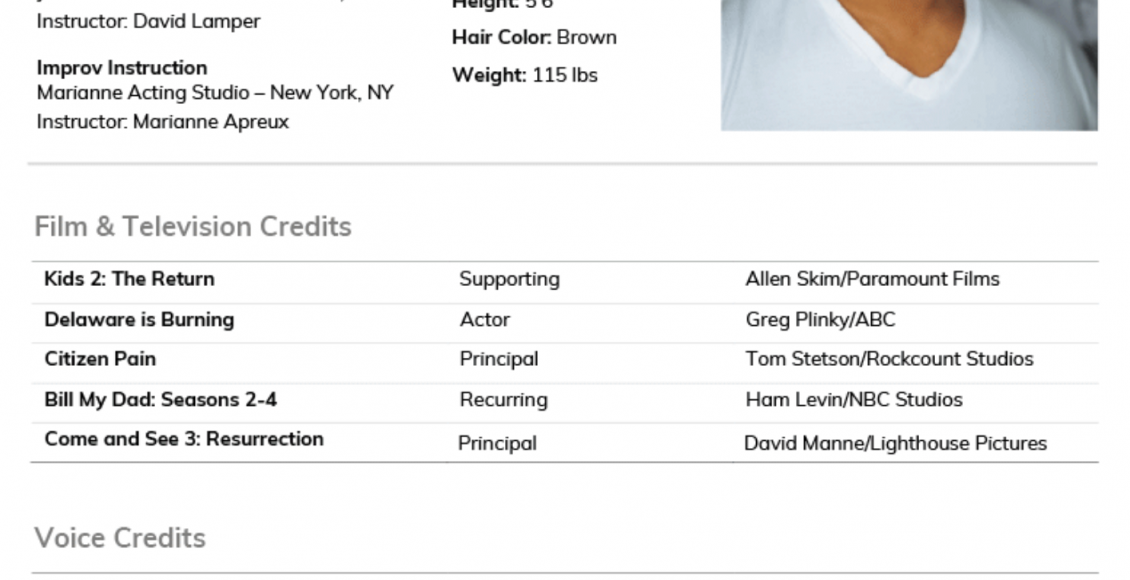 Berikut disediakan beberapa contoh template resume bagi bidang kerjaya lakonan untuk anda lihat. Ketiga-tiga resume ini mempunyai design yang berbeza.